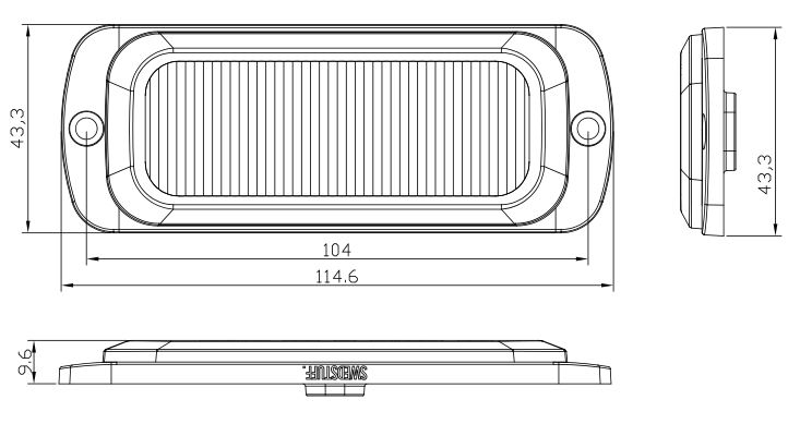 Technische Zeichnung einer rechteckigen SWEDSTUFF Stroboskop-Warnleuchte mit Montagebohrungen.