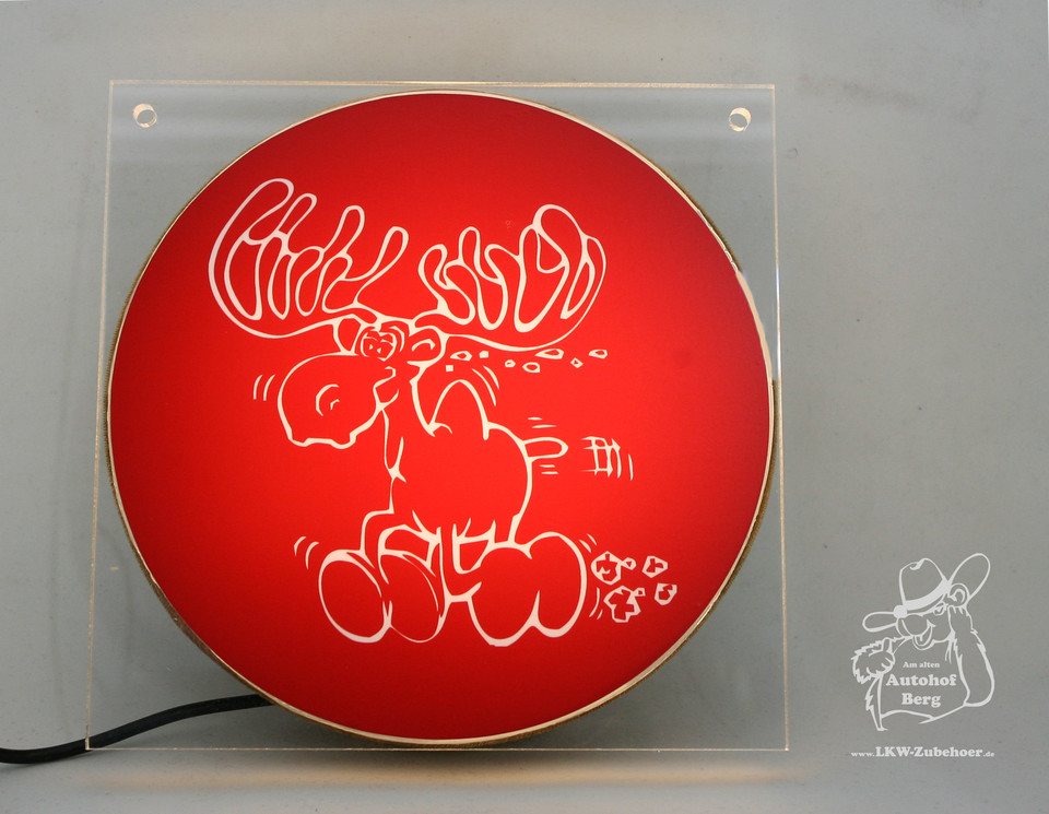 Beleuchtetes LKW-Schild aus Plexiglas mit rotem, rundem Einsatz. Weißes Running Elch Motiv und Schriftzug