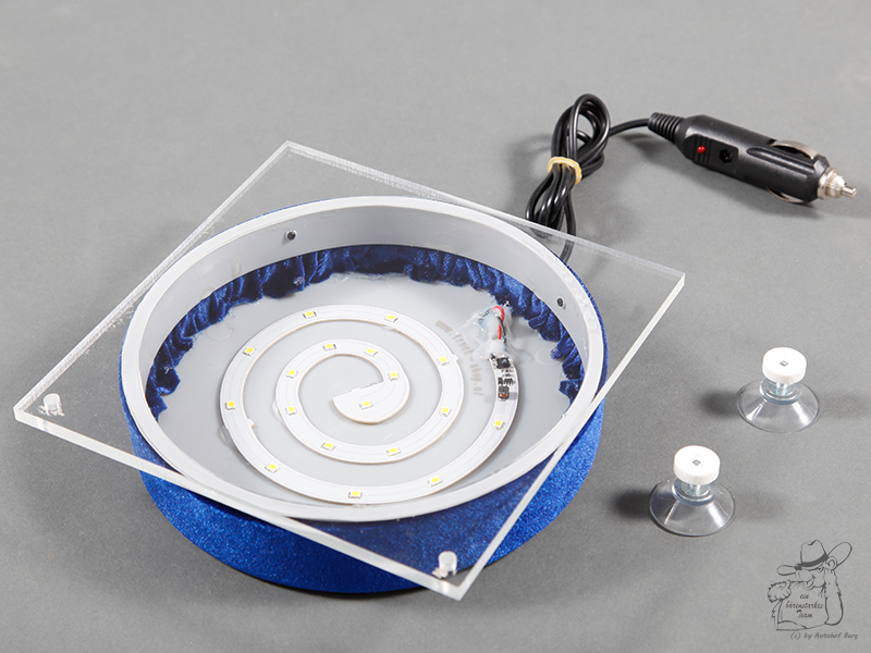 Leuchtschild mit quadratischer Acrylplatte, runder blauer Basis, LED-Spirale, USB-Anschlusskabel und Saugnäpfen.