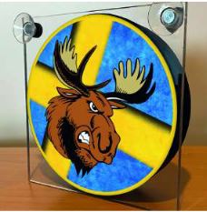 Leuchtkasten aus Acryl mit rundem Schild. Darauf ein Böser Elch vor gelb-blauem Hintergrund. Mit Saugern.