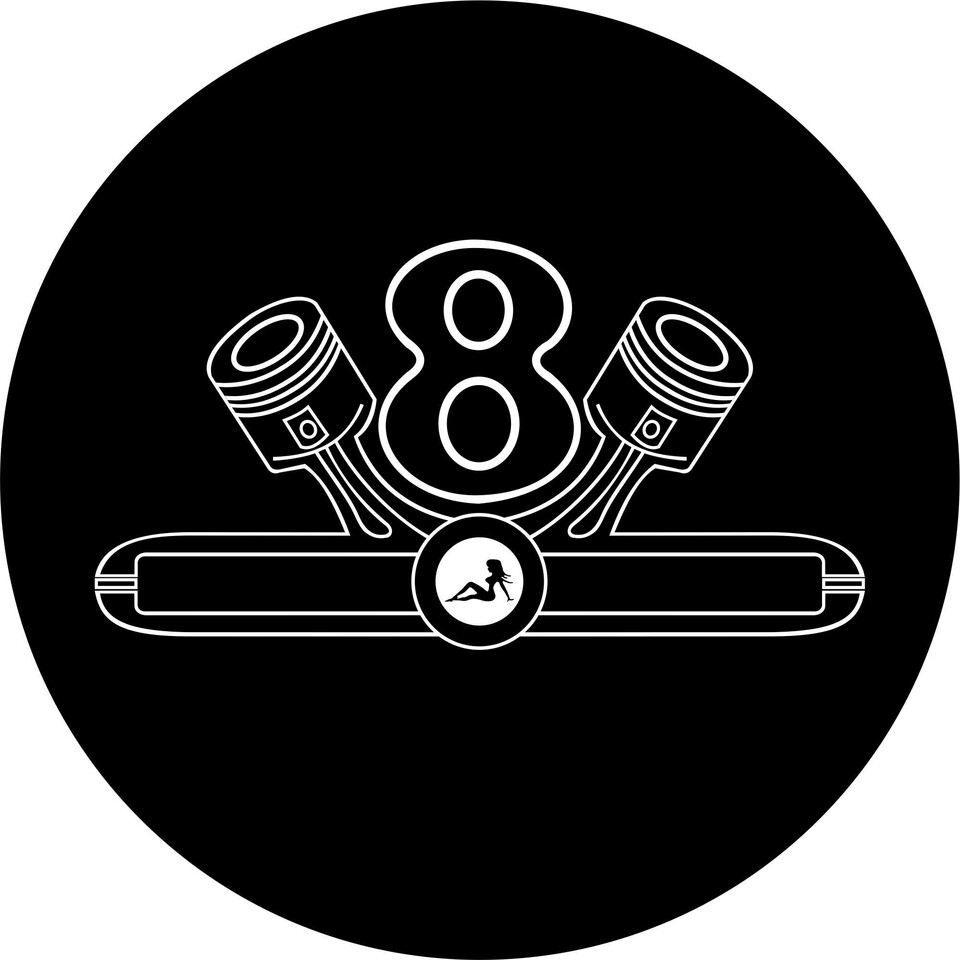 Innenbeleuchtetes Schild mit V8-Design, flankiert von Kolben und einer liegenden Frauensilhouette in Weiß auf Schwarz.