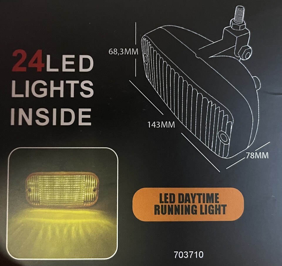 Gelbe DTS LED Tagfahrleuchten vom Typ Schwedenleuchte mit Montage und Kabeln. Die Leuchten haben geriffelte Gläser.