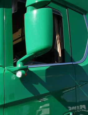 Kleines, leuchtendes LED-Spiegellicht mit roter Seite am grünen LKW-Spiegel montiert.