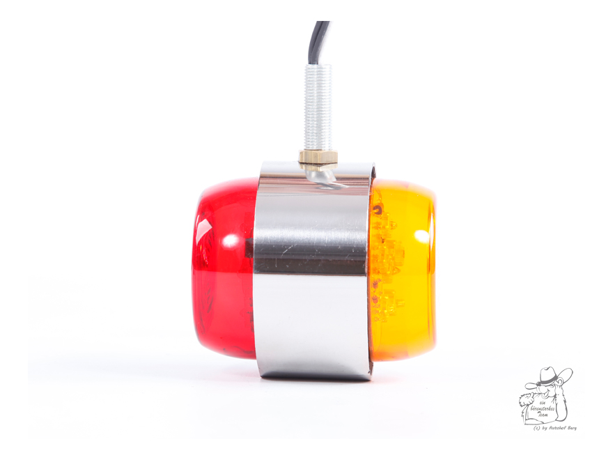 Kleines LED Spiegel Licht mit roter und bernsteinfarbener Leuchtseite, in Chromgehäuse.