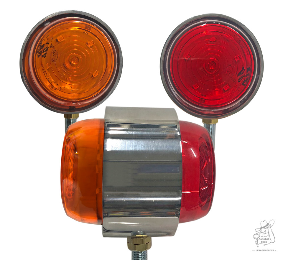 Kleines LED-Spiegellicht mit roter und gelber Linse und Chromrahmen.