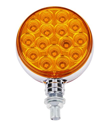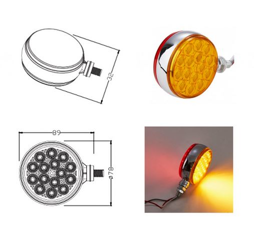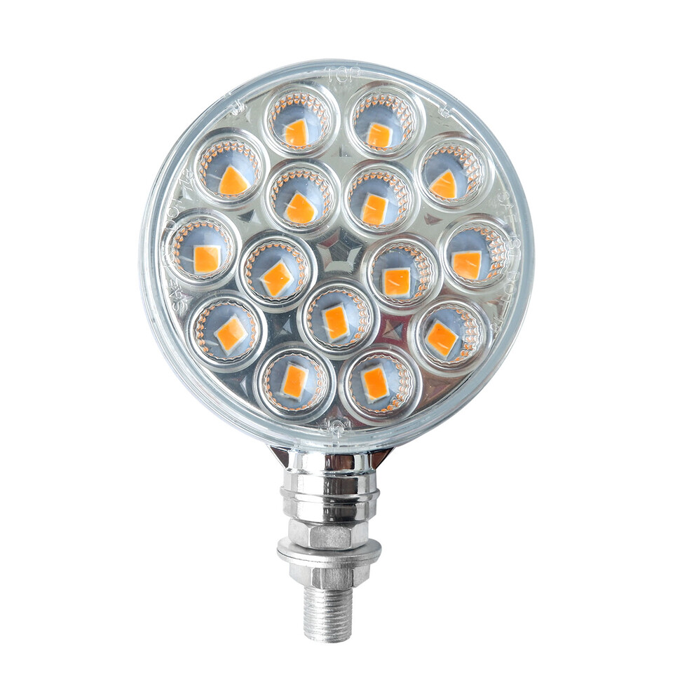 Kleine, runde LKW-Spiegellampe mit orangefarbenen LEDs, Chromrand und Montagegewinde.