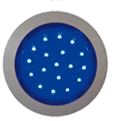 Runde LED Innenraumlampe mit silbernem Metallrahmen und blauer Leuchtfläche mit weißen LEDs.