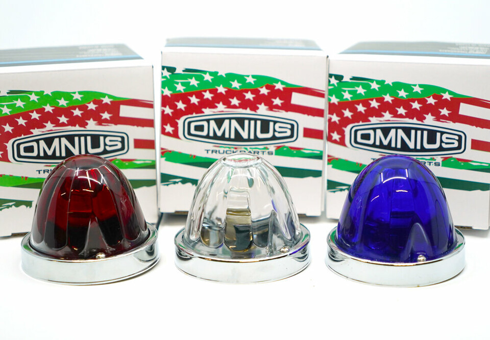 Omnius LKW-Innenbeleuchtung "Wassermelone" mit roter Glaslinse und Chromsockel, daneben die Produktverpackung.