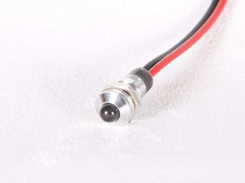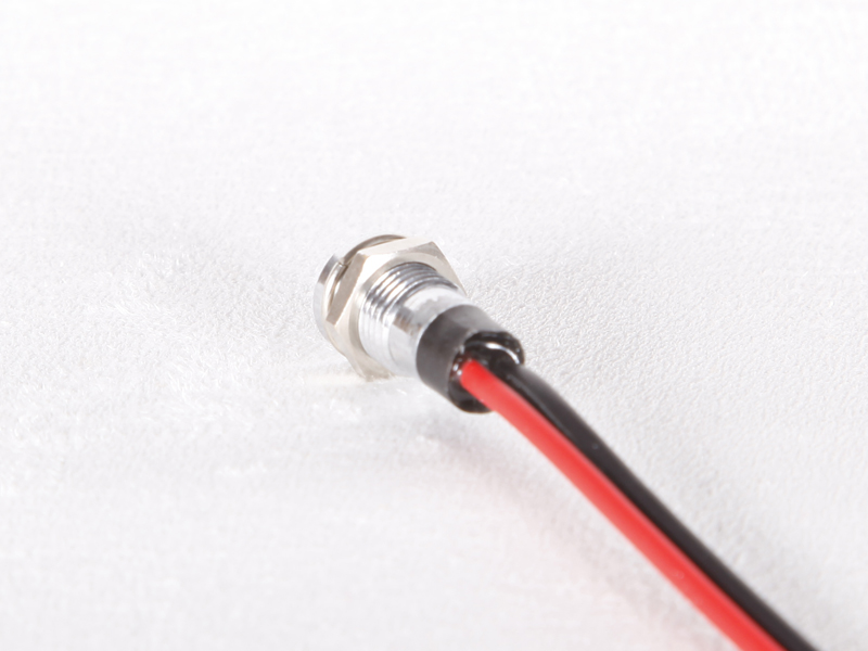 Eine silberne, schraubbare LED mit klarem Kopf und roten sowie schwarzen Anschlusskabeln vor weißem Hintergrund.