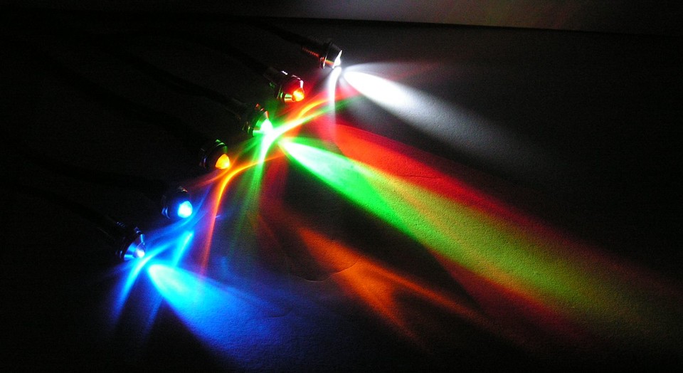 Reihe leuchtender LED-Schraubleuchten in Blau, Orange, Grün, Rot und Weiß mit Metallgehäuse.