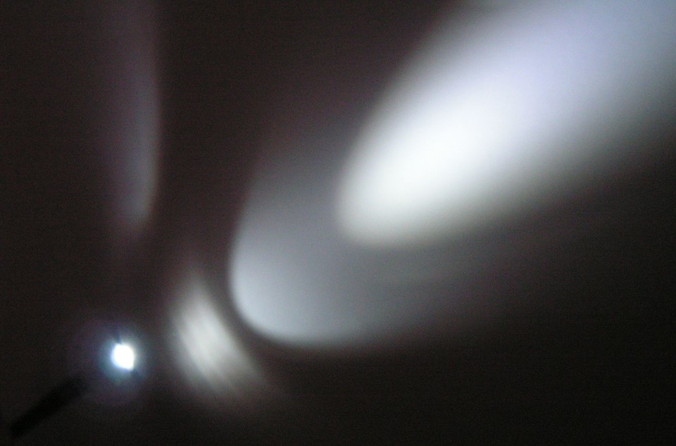 Helles, weißes Licht einer LED, das sich in dunkler Umgebung ausbreitet.