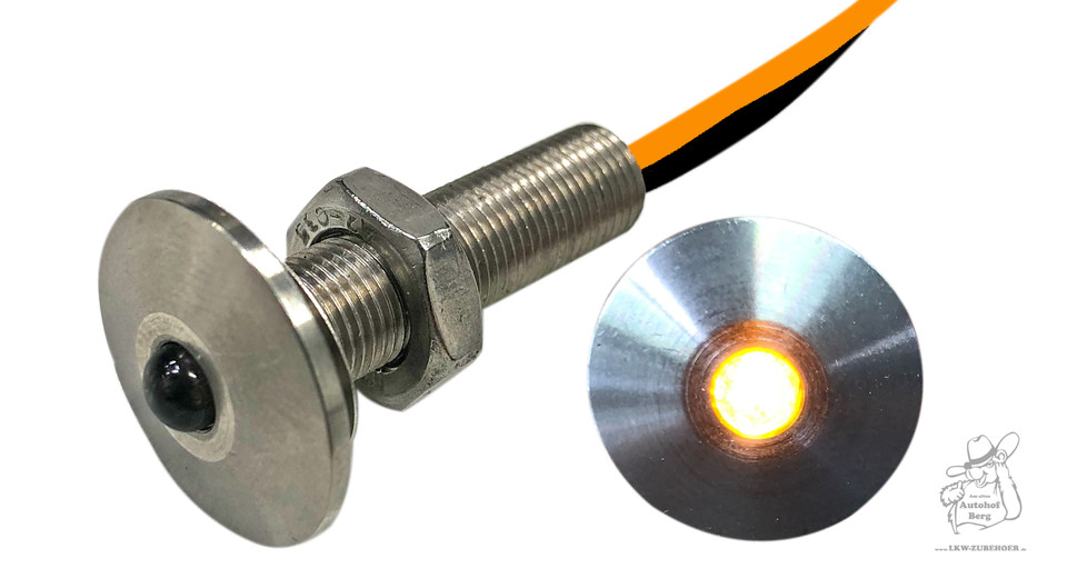 Zwei Ansichten einer schraubbaren LED: eine silberne LED mit schwarzer Linse und Kabeln, die andere leuchtend orange.