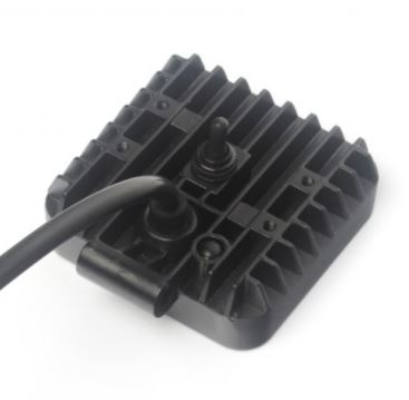 Schwarze, quadratische LED Arbeitsleuchte mit Aluminium-Kühlrippen und angeschlossenem Stromkabel.
