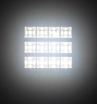 Leuchtende, quadratische LED Arbeitsleuchte mit mehreren hellen LEDs, die weißes Licht abstrahlen.