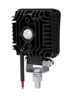Quadratische LED Arbeitsleuchte mit schwarzem Aluminiumgehäuse und silberner Montagehalterung.