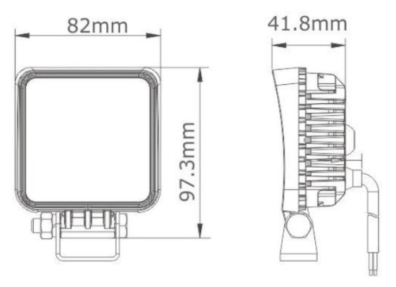 Vorder- und Seitenansicht einer quadratischen LED Arbeitsleuchte aus Aluminium mit Bemaßung.