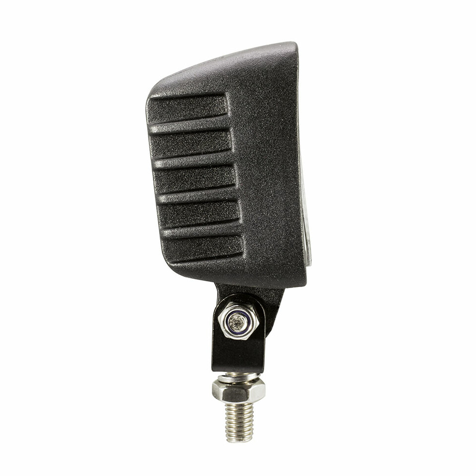 Schwarze, eckige Mini-Arbeitsleuchte mit silberner Montagehalterung, Seitenansicht.