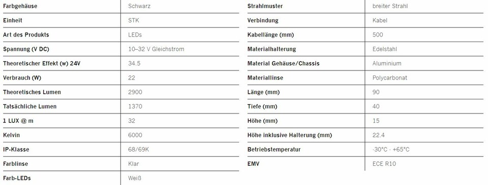 Diese Arbeitsleuchte ist unglaublich langlebig und besteht aus robustem Aluminium und unzerbrechlichem Polycarbonat. Es verfügt über die IP-Klasse IP68/IP69K und das Gehäuse ist mit einem Speziallack lackiert, der zusätzlichen Schutz vor Salz und Schmutz bietet. Das macht es zu einer hervorragenden Wahl für skandinavische Straßen oder andere Orte, an denen es starker Beanspruchung ausgesetzt ist.