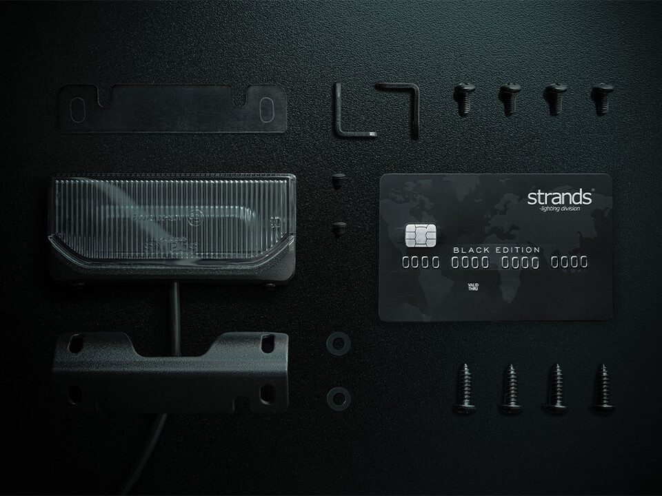 Strands Unity Ultra Flat Arbeitsleuchte, Halterungen und Schrauben. Eine schwarze Kreditkarte zeigt die kompakte Größe.