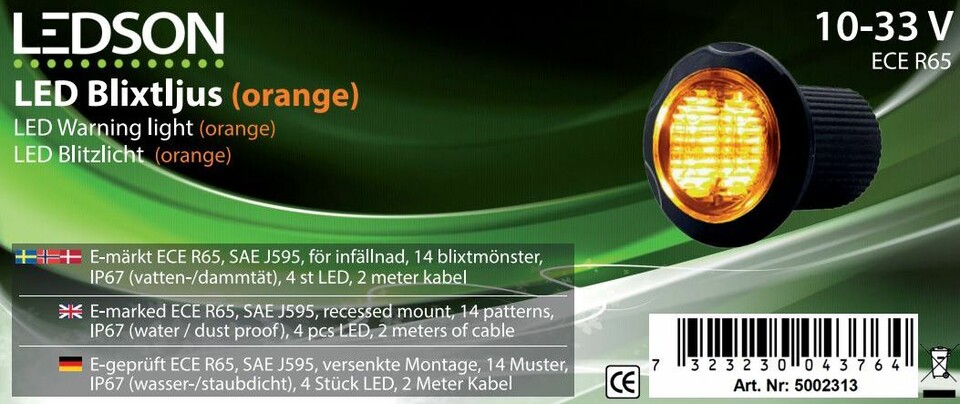 Kompakte orangefarbene LEDSON LED-Blitzleuchte zum Einbau, ECE R65 zertifiziert.