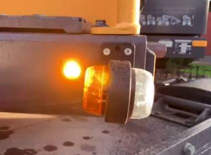 Orange leuchtende, eingebaute LED-Blitzleuchte neben einer extern montierten orange-weißen Leuchte an einem LKW.