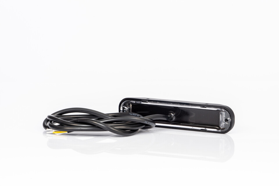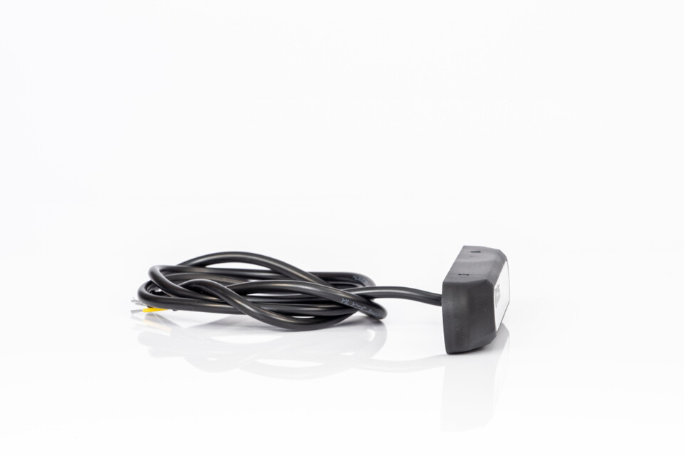 Ein schwarzer LED-Blitzer mit klarer Linse und aufgerolltem schwarzem Kabel mit abisolierten Enden.