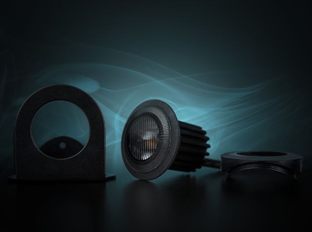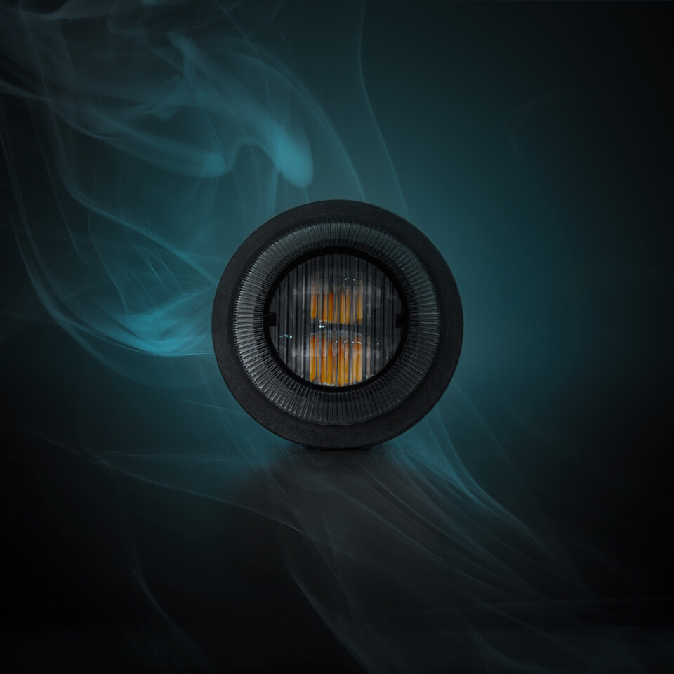 Ein runder, schwarzer LED Blitzer mit getönter Linse und geripptem Gehäuse.