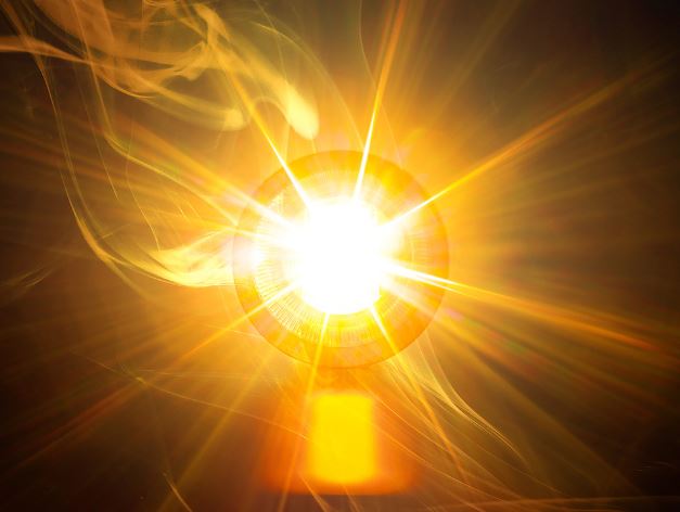 Leuchtend oranger, runder LED Blitzer mit intensiven Lichtstrahlen auf dunklem Hintergrund.