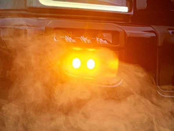 Ein runder, orange leuchtender LED Blitzer ist an einem dunklen LKW montiert, umgeben von orangefarbenem Rauch.