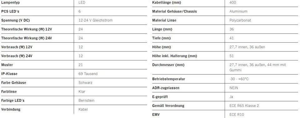 Tabelle mit technischen Spezifikationen für den LED Blitzer Gloria: Lampentyp, Material, klare Linse und bernsteinfarbene LEDs.