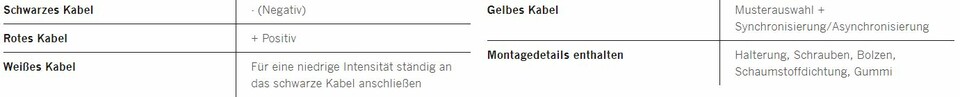 Tabelle mit technischen Details: Kabelbelegung (schwarz, rot, weiß, gelb) und enthaltene Montageteile (Halterung, Schrauben, Dichtungen).