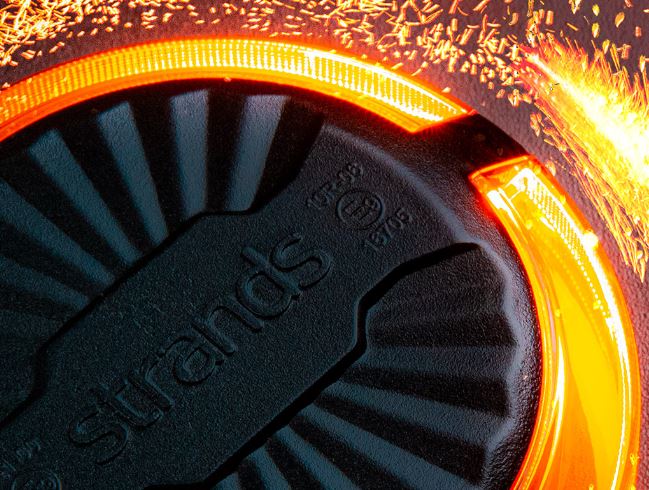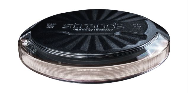 Runde Strands Rundumleuchte mit schwarzem Gehäuse und klarer Linse, Strands Logo auf der Oberseite.