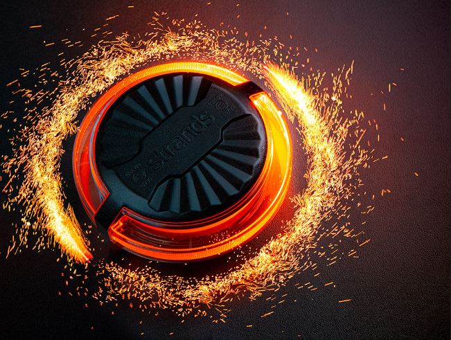 Runde, schwarze Strands Rundumleuchte mit bernsteinfarbenem Leuchtring und umherfliegenden Funken.