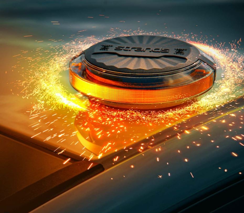 Strands Rundumleuchte mit schwarzem Gehäuse und bernsteinfarben leuchtender klarer Linse, umgeben von Funken.