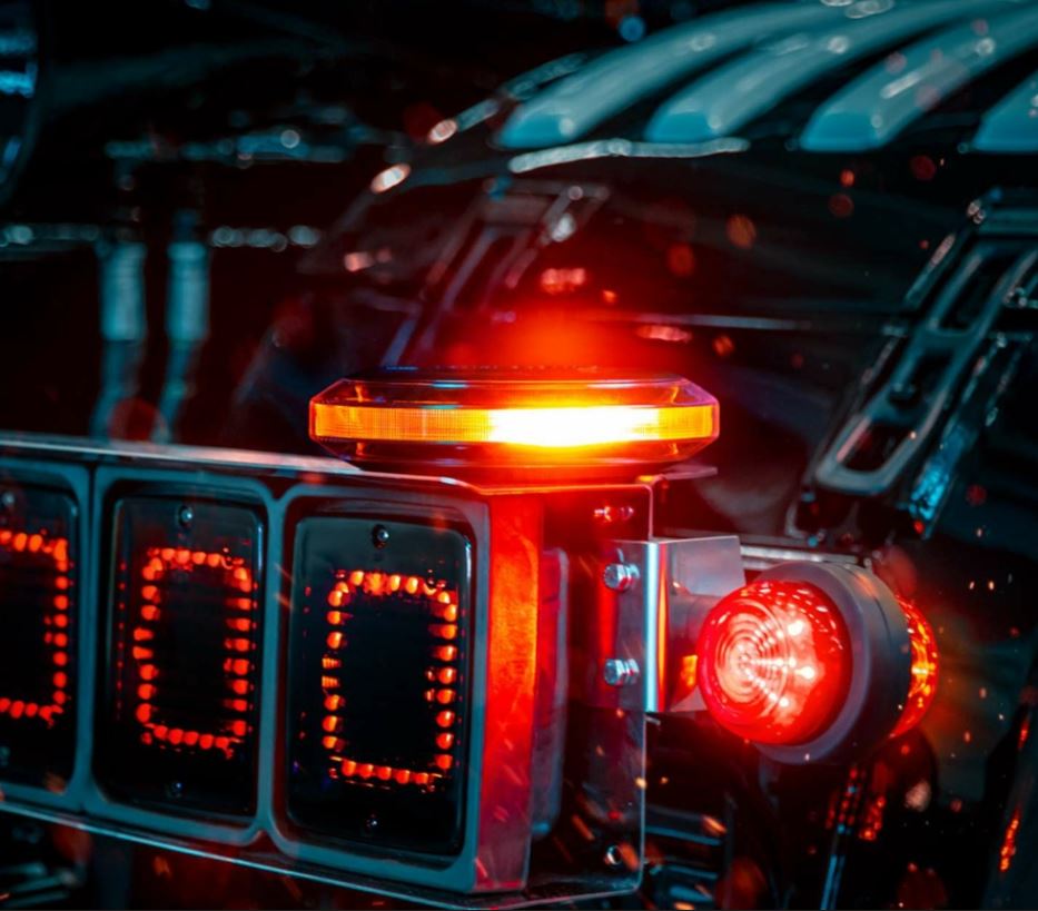 Strands Firefly Rundumleuchte mit orangefarbenem Licht, montiert am LKW-Heck, umgeben von roten Rückleuchten.