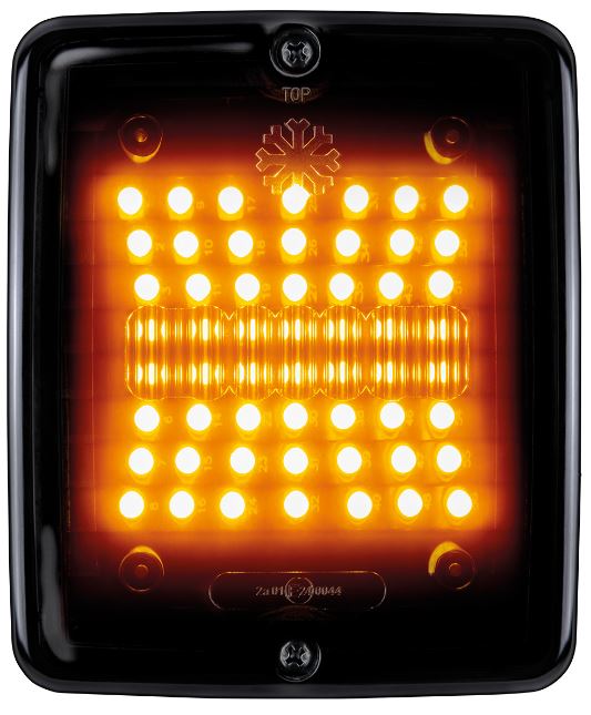 Eckige LKW-Heckleuchte mit schwarzem Gehäuse und dunkler Linse. Orangefarbene LEDs leuchten als Blinklicht.