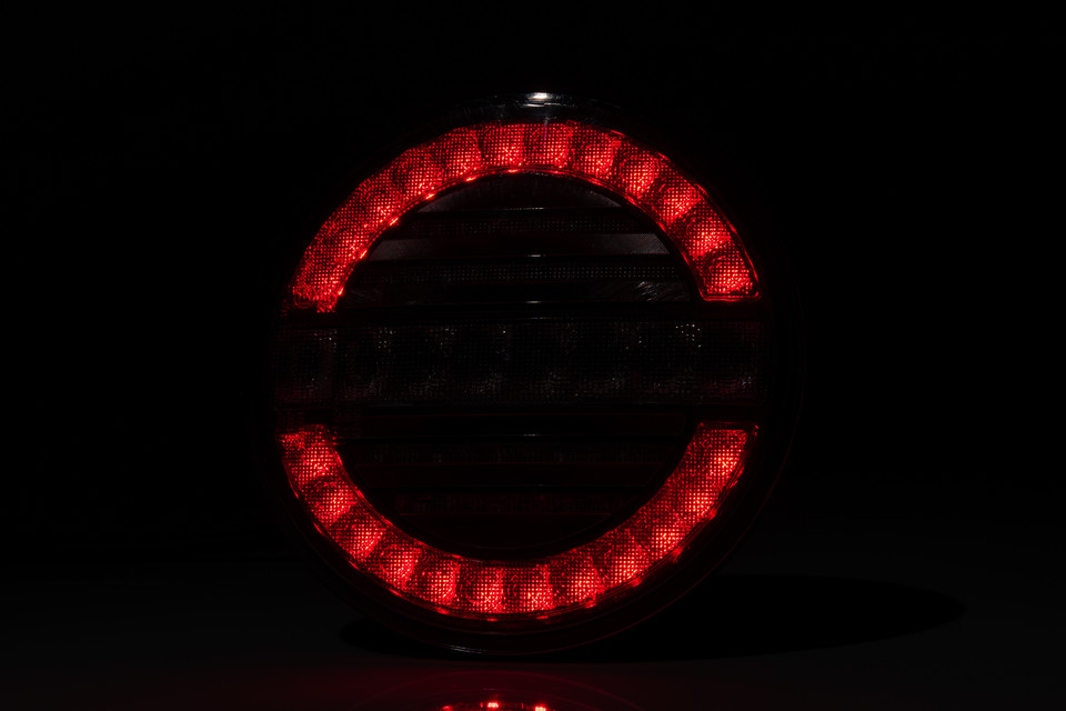 Runde LED-Heckleuchte leuchtet rot mit mehreren horizontalen LED-Streifen.