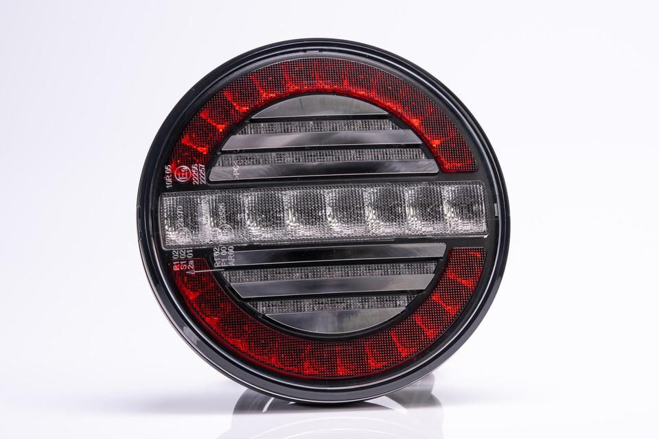 Runde LED-Heckleuchte mit leuchtend rotem Rücklicht und weißem Rückfahrlicht.