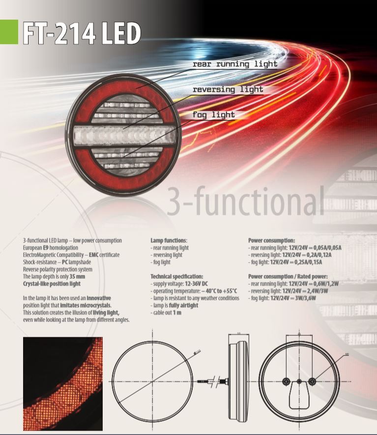 Runde LED Heckleuchte für LKW mit rotem Rücklicht, weißem Rückfahrlicht und grauen Nebelleuchten.