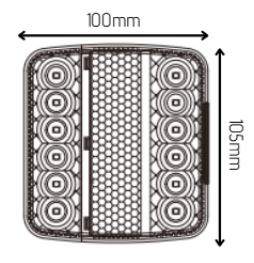 Draufsicht einer schwarzen LED-Lampe (ABS-Gehäuse) mit Gittermuster und runden LEDs, 100x105mm.