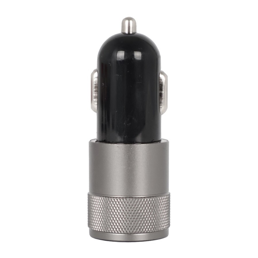 Ein runder, schwarzer USB-Ladeadapter mit silbernem Rand und zwei USB-Anschlüssen, beschriftet mit 2.1A und 1.0A.