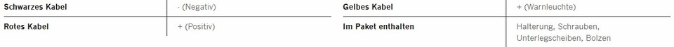 Tabelle zeigt Kabelbelegung (Schwarz, Rot, Gelb) für Strands UNITY Szenenlicht und enthaltenes Montagezubehör.