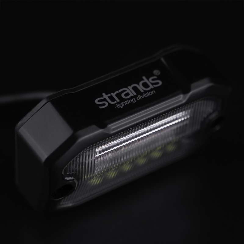 Strands UNITY Szenenlicht in Schwarz mit klarer Linse und leuchtenden LEDs für Rückfahr- und Warnlicht.