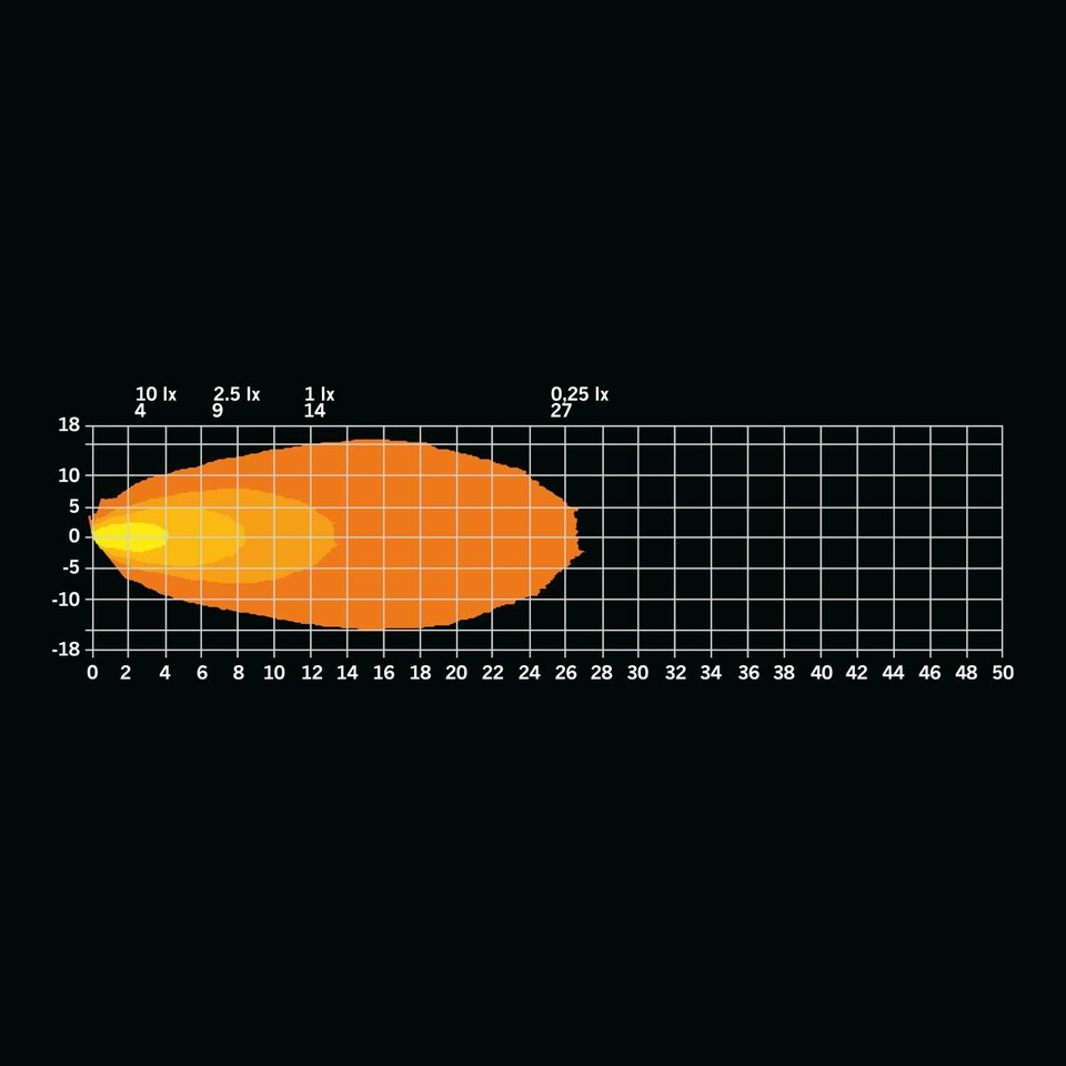Lichtverteilung des Strands UNITY Szenenlichts auf einem Gitter, zeigt breites, ovales Lichtmuster in Gelb und Orange.