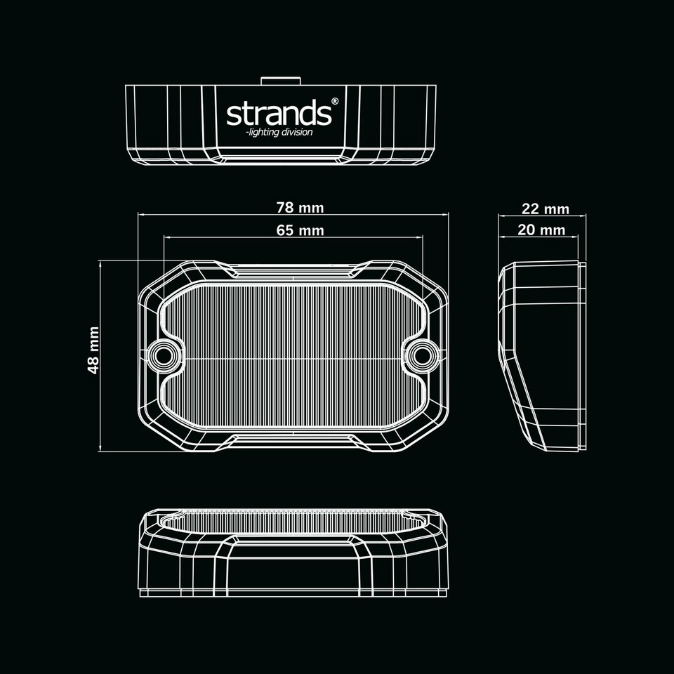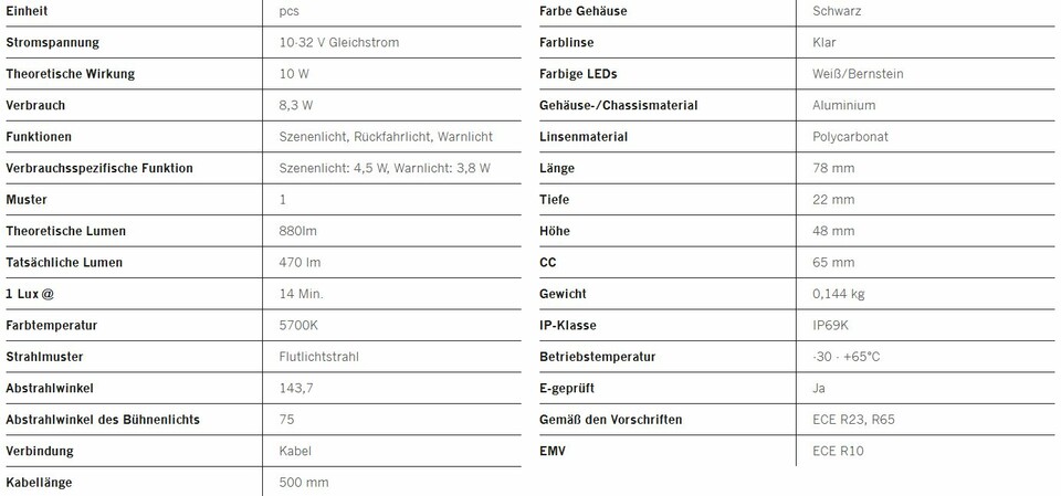 Dank der kompakten Größe von 78 x 22 x 48 mm und 65 mm CC passt das Unity-Szenenlicht in alle Fahrzeuge. Das breite Lichtmuster ist kraftvoll und präzise und hat zudem einen geringen Stromverbrauch von nur 4,5 W. Die Farbtemperatur von 5700 K garantiert ein klares und sauberes Lichtmuster für maximale Sichtbarkeit. Der 75°-Szenenlichtwinkel lenkt das Licht genau dorthin, wo es benötigt wird und beleuchtet einen großen Bereich hinter dem Fahrzeug.