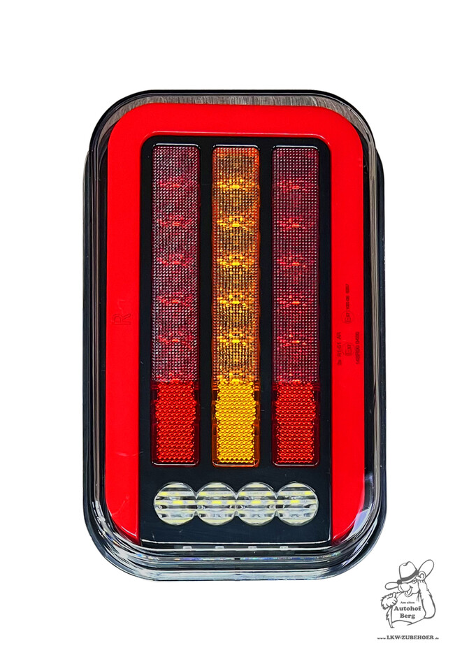 Rechteckiges LED Rücklicht mit roten, gelben und weißen Lichtsegmenten in schwarzem Gehäuse.