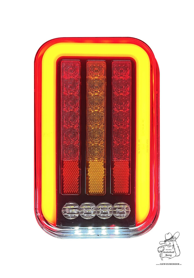 Rechteckiges LED Rücklicht mit gelbem Rahmen, roten und gelben Segmenten, sowie weißen LEDs.