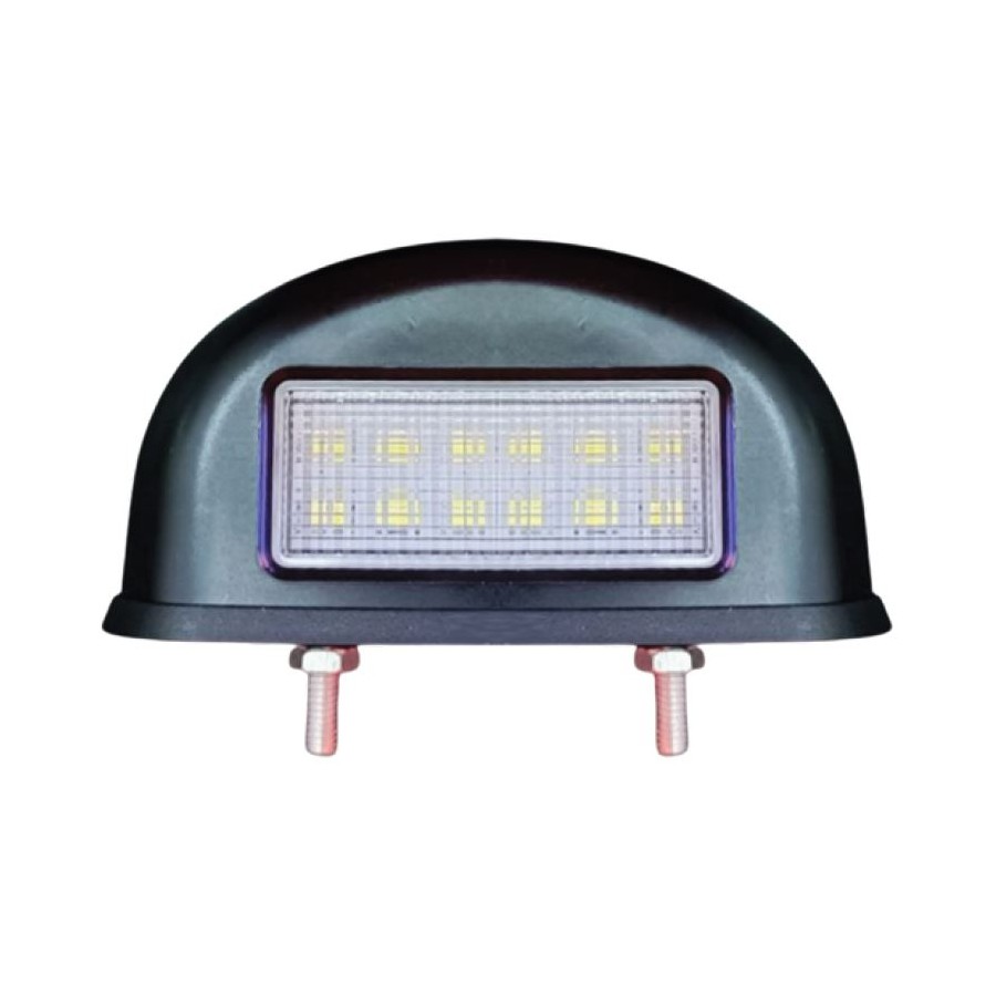 Schwarze Kennzeichenleuchte mit klarer Linse und mehreren weißen LEDs, montierbar mit zwei Schrauben.